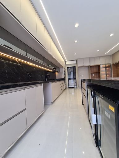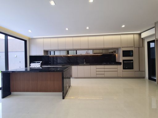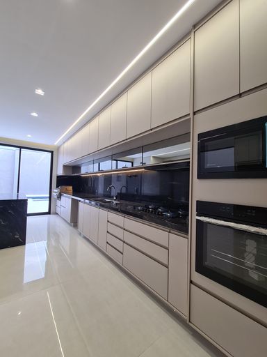 Fogão embutido, cooktop, forno de micro-ondas e churrasqueira à gás instalados