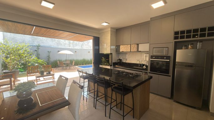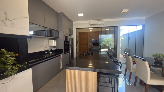 >Área Gourmet c/ Cozinha planejada com ilha, churrasqueira a carvão, cooktop e forno
